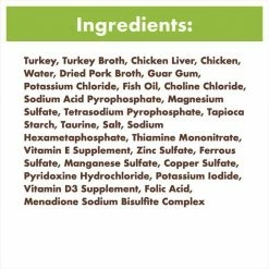 Turkey, Chicken Liver, Pork Broth, Turkey Broth, Natural Flavor, Guar Gum, Potassium Chloride, Fish Oil (preserved with Mixed Tocopherols), Sodium Acid Pyrophosphate, Magnesium Sulfate, Tetrasodium Pyrophosphate, Tapioca Starch, Choline Chloride, Salt, Taurine, Sodium Hexametaphosphate, Thiamine Mononitrate (Vitamin B1), Vitamin E Supplement, Zinc Sulfate, Ferrous Sulfate, Manganese Sulfate, Potassium Iodide, Pyridoxine Hydrochloride (Vitamin B6), Copper Sulfate, Vitamin D3 Supplement, Folic Acid, Menadione Sodium Bisulfite Complex (source of Vitamin K Activity).