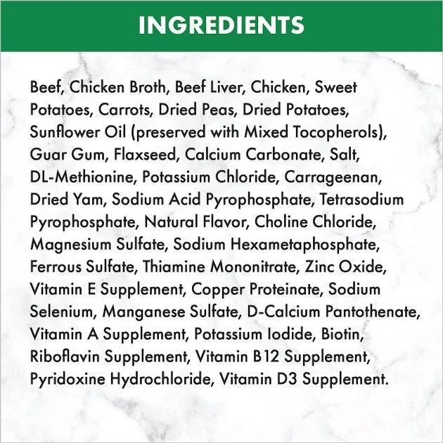 Beef, Chicken Broth, Beef Liver, Chicken, Sweet Potatoes, Carrots, Dried Peas, Dried Potatoes, Sunflower Oil (preserved with Mixed Tocopherols), Guar Gum, Flaxseed, Calcium Carbonate, Salt, DL-Methionine, Potassium Chloride, Carrageenan, Dried Yam, Sodium Acid Pyrophosphate, Tetrasodium Pyrophosphate, Natural Flavor, Choline Chloride, Magnesium Sulfate, Sodium Hexametaphosphate, Ferrous Sulfate, Thiamine Mononitrate, Zinc Oxide, Vitamin E Supplement, Copper Proteinate, Sodium Selenium, Manganese Sulfate, D-Calcium Pantothenate, Vitamin A Supplement, Potassium Iodide, Biotin, Riboflavin Supplement, Vitamin B12 Supplement, Pyridoxine Hydrochloride, Vitamin D3 Supplement.