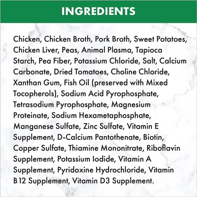 Chicken, Chicken Broth, Pork Broth, Sweet Potatoes, Chicken Liver, Peas, Animal Plasma, Tapioca Starch, Pea Fiber, Potassium Chloride, Salt, Calcium Carbonate, Dried Tomatoes, Choline Chloride, Xanthan Gum, Fish Oil (preserved with Mixed Tocopherols), Sodium Acid Pyrophosphate, Tetrasodium Pyrophosphate, Magnesium Proteinate, Sodium Hexametaphosphate, Manganese Sulfate, Zinc Sulfate, Vitamin E Supplement, D-Calcium Pantothenate, Biotin, Copper Sulfate, Thiamine Mononitrate, Riboflavin Supplement, Potassium Iodide, Vitamin A Supplement, Pyridoxine Hydrochloride, Vitamin B12 Supplement, Vitamin D3 Supplement.