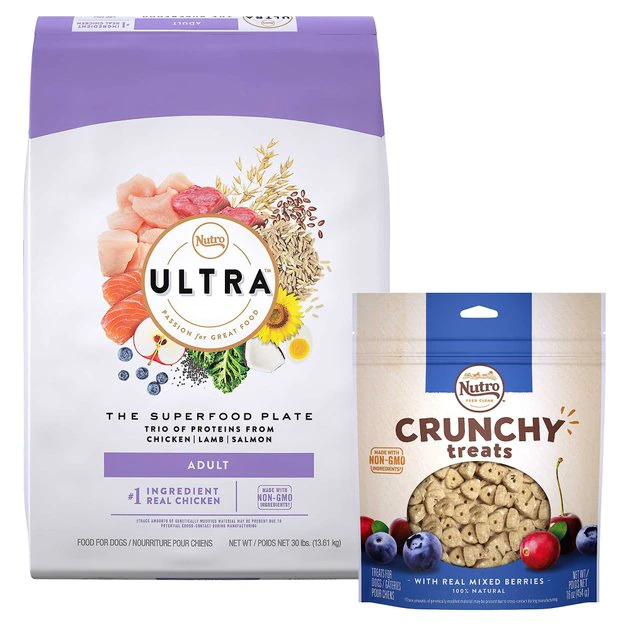 Treat your pooch to some good, clean snacking with Nutro Ultra Adult Dry Food + Crunchy with Real Mixed Berries Dog Treats. The dry food contains the perfect mix of premium lean proteins, antioxidant-rich fruits and vegetables, whole grains and healthy oils to help your dog be at his best. Combined protein sources from high-quality natural and holistic ingredients ensure optimal Amino Acid levels and great taste for your dog. Additionally, the crunchy dog treats are made with high-quality protein from chicken as the foundation of the recipe. Each resealable bag is packed with crunchy bites perfect for when your pal has the munchies, or for training, too.