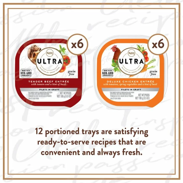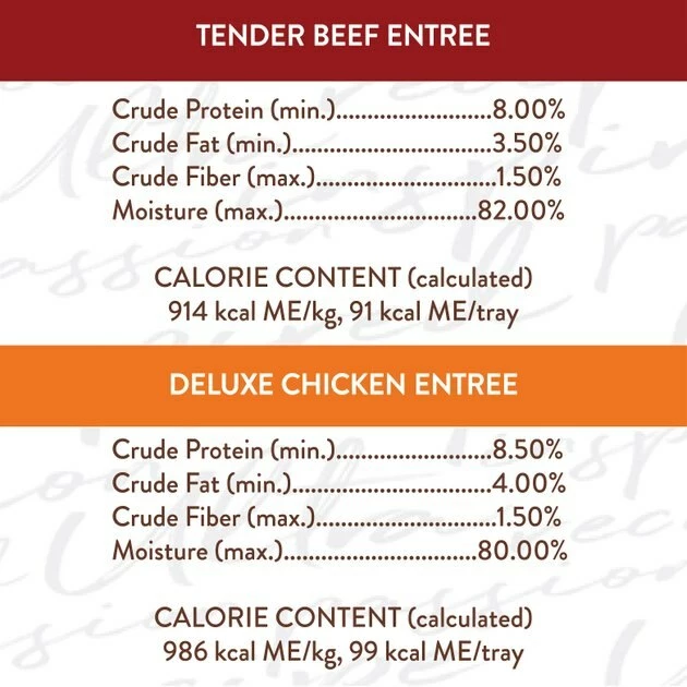 - Contains 2 flavors of Grain-Free Filets in Gravy including Tender Beef Entrée with tomato and a hint of basil and Deluxe Chicken Entrée with tomatoes, spring vegetables and a hint of basil.
