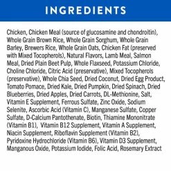 New: Chicken, Chicken Meal (source of glucosamine and chondroitin), Whole Grain Brown Rice, Whole Grain Sorghum, Whole Grain Barley, Brewers Rice, Whole Grain Oats, Chicken Fat (preserved with Mixed Tocopherols), Natural Flavors, Lamb Meal, Salmon Meal, Dried Plain Beet Pulp, Whole Flaxseed, Potassium Chloride, Choline Chloride, Citric Acid (preservative), Mixed Tocopherols (preservative), Whole Chia Seed, Dried Coconut, Dried Egg Product, Tomato Pomace, Dried Kale, Dried Pumpkin, Dried Spinach, Dried Blueberries, Dried Apples, Dried Carrots, DL-Methionine, Salt, Vitamin E Supplement, Ferrous Sulfate, Zinc Oxide, Sodium Selenite, Ascorbic Acid (Vitamin C), Manganese Sulfate, Copper Sulfate, D-Calcium Pantothenate, Biotin, Thiamine Mononitrate (Vitamin B1), Vitamin B12 Supplement, Vitamin A Supplement, Niacin Supplement, Riboflavin Supplement (Vitamin B2), Pyridoxine Hydrochloride (Vitamin B6), Vitamin D3 Supplement, Manganous Oxide, Potassium Iodide, Folic Acid, Rosemary Extract.