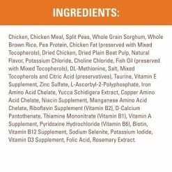 Chicken, Chicken Meal, Split Peas, Whole Grain Sorghum, Whole Brown Rice, Pea Protein, Chicken Fat (preserved with Mixed Tocopherols), Dried Chicken, Dried Plain Beet Pulp, Natural Flavor, Potassium Chloride, Choline Chloride, Fish Oil (preserved with Mixed Tocopherols), DL-Methionine, Salt, Mixed Tocopherols and Citric Acid (preservatives), Taurine, Vitamin E Supplement, Zinc Sulfate, L-Ascorbyl-2-Polyphosphate, Iron Amino Acid Chelate, Yucca Schidigera Extract, Copper Amino Acid Chelate, Niacin Supplement, Manganese Amino Acid Chelate, Riboflavin Supplement (Vitamin B2), D-Calcium Pantothenate, Thiamine Mononitrate (Vitamin B1), Vitamin A Supplement, Pyridoxine Hydrochloride (Vitamin B6), Biotin, Vitamin B12 Supplement, Sodium Selenite, Potassium Iodide, Vitamin D3 Supplement, Folic Acid, Rosemary Extract.